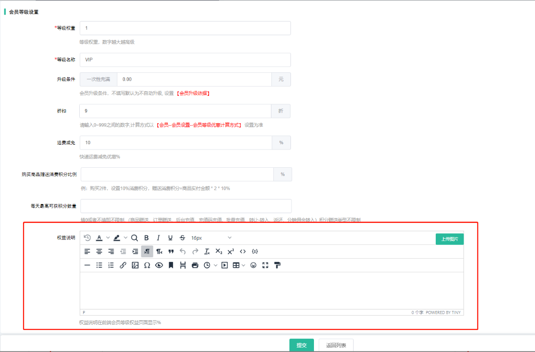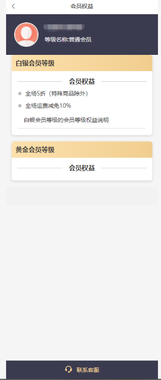 给某一等级会员的减价奖励优惠(值为空代表不设置折扣/减免运费)。用于会员专属促销活动。折扣运费减免可在前端会员等级权益页面显示,如下图
