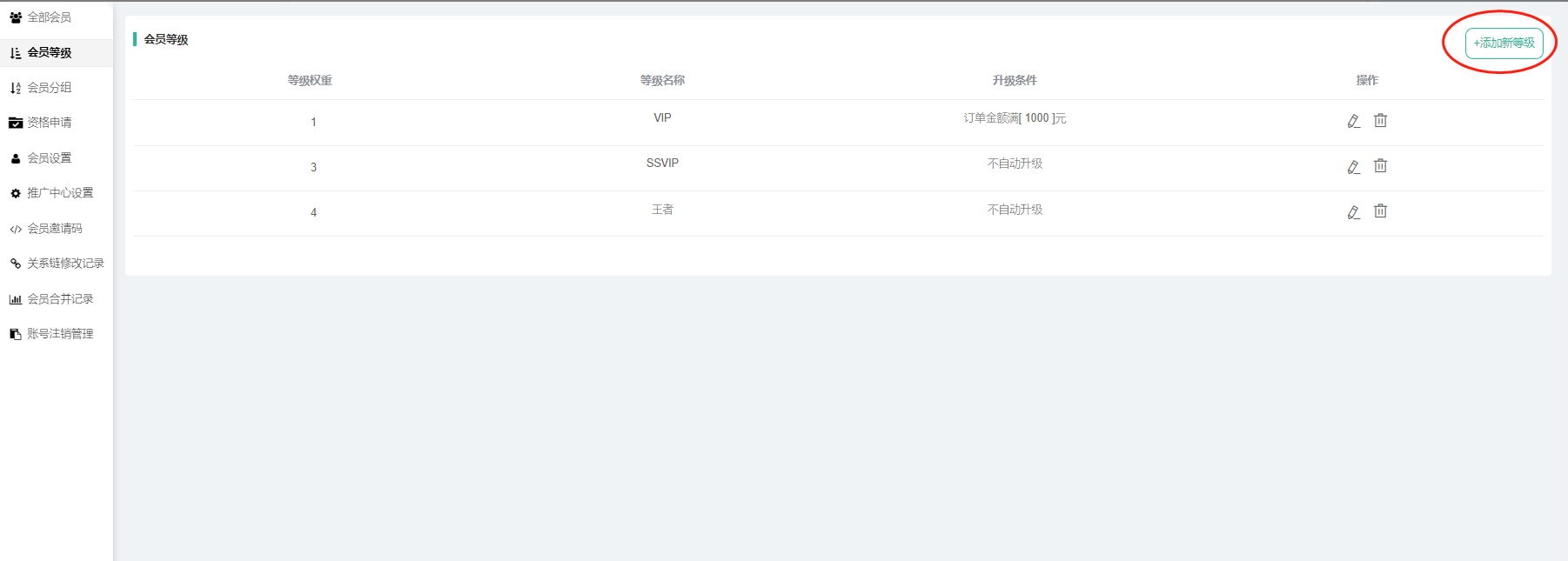 所有成为商城的会员等级为默认等级,可以通过后台-会员管理手动调整会员等级,也可以设置会员自动升级。